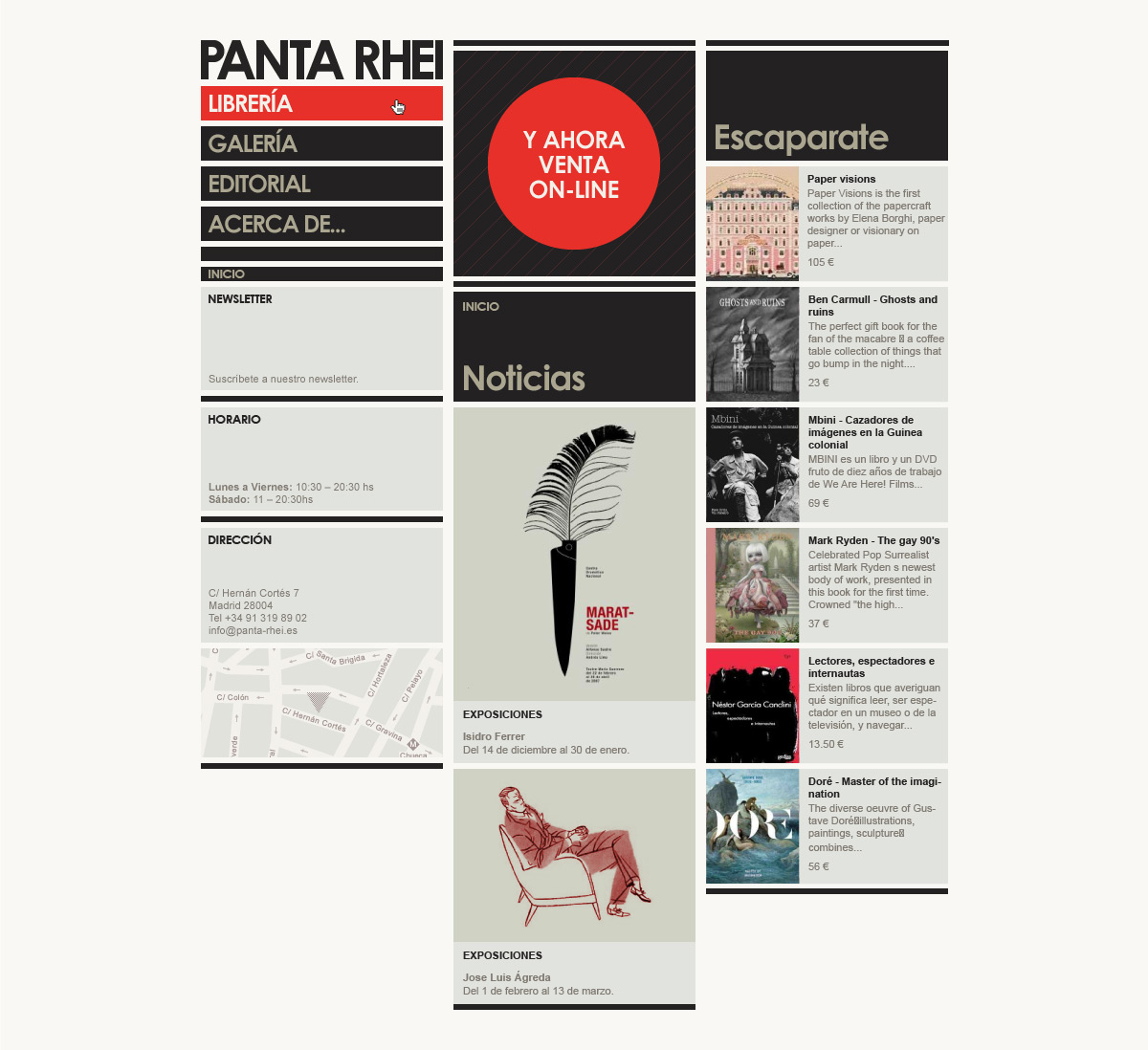 Desde hace ya más de 15 años, Panta Rhei lleva siendo el santuario de culto de muchos de los diseñadores, illustradores, artistas y aficionados al arte en general en Madrid. Situada entre los míticos barrios de Chueca y Malasaña, este proyecto visionario dispone de una galería en su propio sótano, donde se pueden ver obras de los más variopintos artistas alternativos (ilustración). Todo un lujo.