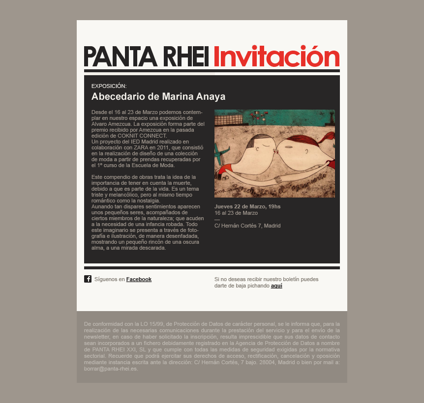Panta Rhei ya contaba con un reputado nombre y marca inicial, por lo que el desarrollo en cuanto a la identidad se centró en el rediseño de su logo actual y la evolución de su identidad, así como la producción de diferentes piezas corporativas como tarjetas de visita o marca-libros – todo un clásico.